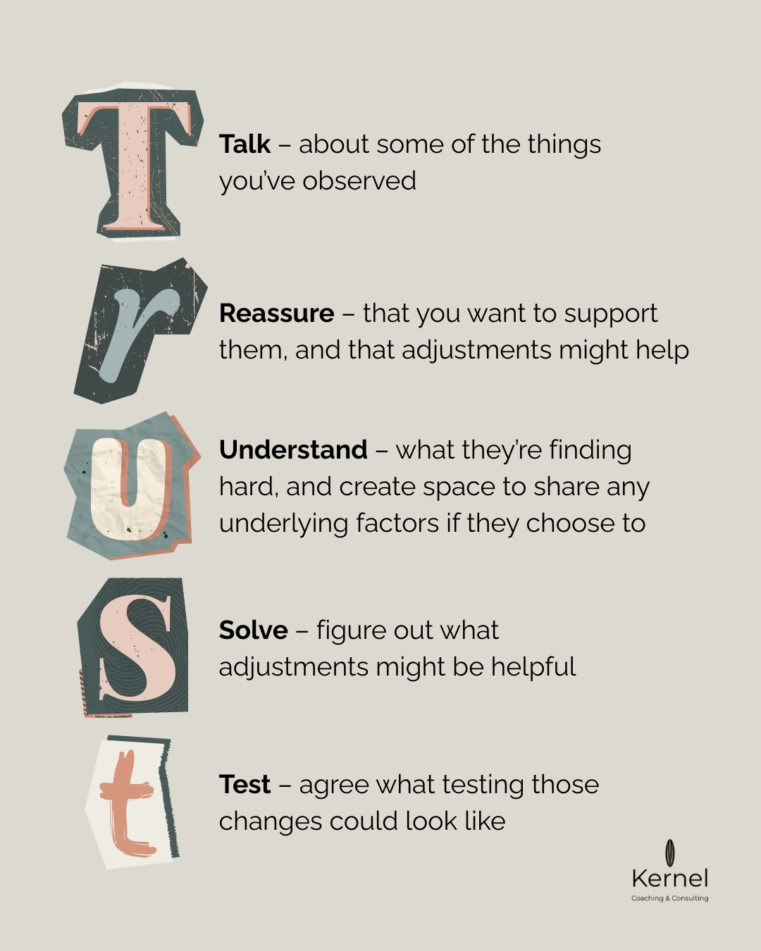 So I wanted to create a model that’s easy to follow, and aligns with ACAS (the Advisory, Conciliation and Arbitration Service, UK) and Equality Act 2010 (UK) best practice and principles for supporting someone with a disability - and the TRUST model was born!